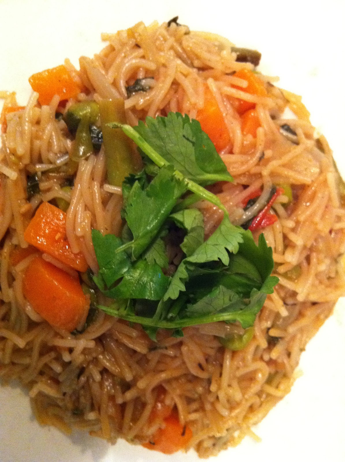 6. Now add the water and let the mixture come to boil. Then add the salt and fried vermicelli and cook till the water is absorbed and the vermicelli is cooked.