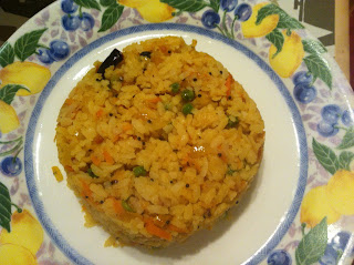 3. Now add green chillies, onions, cashew nuts and carrot. Fry for about 5 to 7 min on high flame stirring in-between.